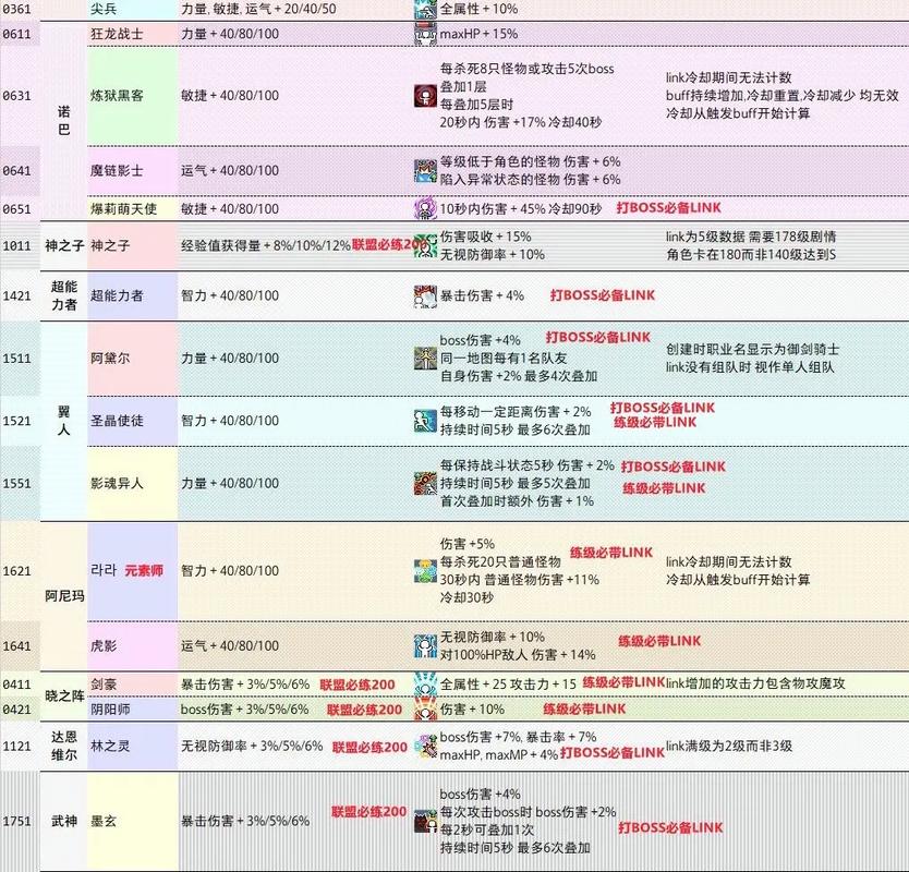 〖伍〗、冒险岛所有职业的 LINK(共享技能):双弩:10经验;火炮:15全属性,5%hpmp;恶魔:10%boss伤害;幻影:5%暴击率;米哈尔:100%泰山,持续90,冷却180;龙人:盒子属性;凯撒:10%HP;天使:10秒面板增加50%;夜光:10%无视防御。
