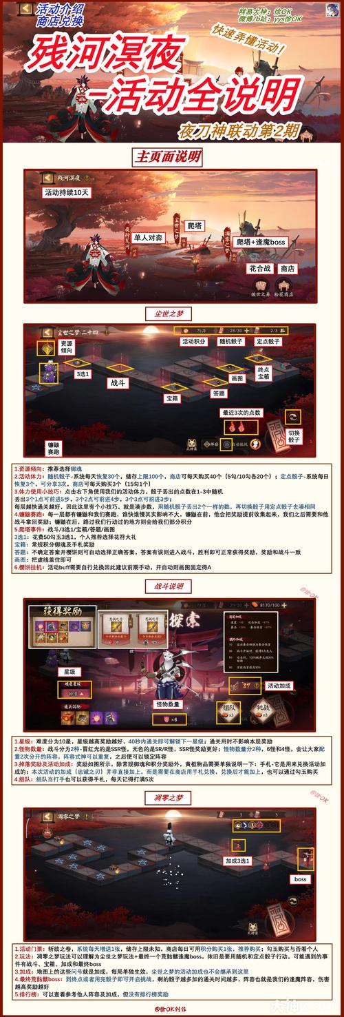 〖肆〗、阴阳师残河溟夜活动介绍活动时间:4月13日维护后-4月22日23:59。玩法介绍:活动分为尘世之梦、凋零之梦、夜行荒河三部分,大人们通过参与尘世之梦、凋零之梦可获得「彼岸花烛」「彼世蝶」兑换丰富奖励。