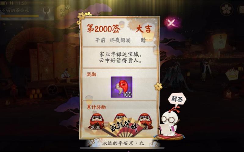 〖叁〗、阴阳师签到大吉的主要作用是影响签到掉落和完成特定成就。影响签到掉落:大吉签到可能会增加签到奖励的稀有度或数量,但具体掉落仍具有随机性。完成特定成就:在阴阳师中,大吉签到是成就系统中的一部分,玩家可以通过收集不同种类的签到结果来完成相应的成就任务。