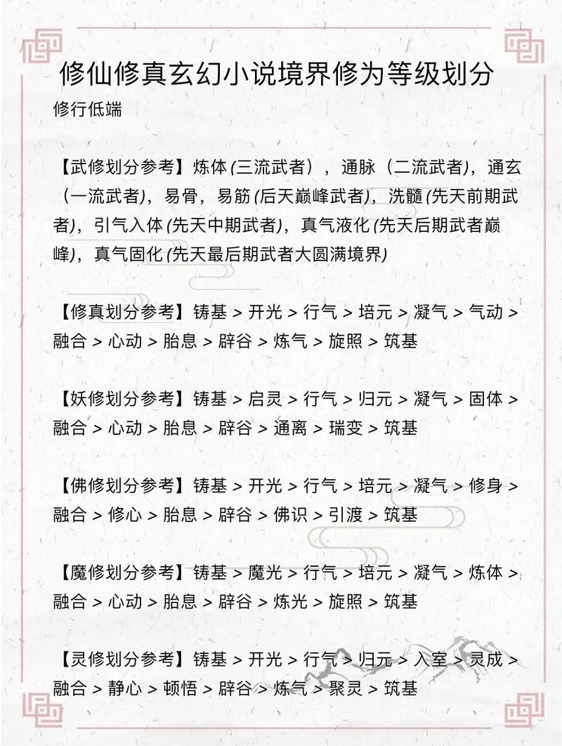 武者的大陆》:武气、武者、武士、武师、武王、武帝、武圣、武仙、武神,每一层分别都是1到9级。《仙逆》:第一步(练气、筑基、结丹、元婴、化神、婴变、问鼎)过渡(阴虚、阳实)第二步(窥捏、净捏、碎捏),第三步(还没看到,不知写没写到。