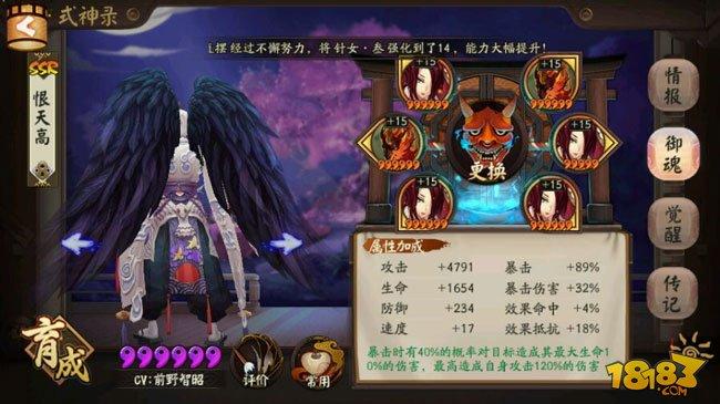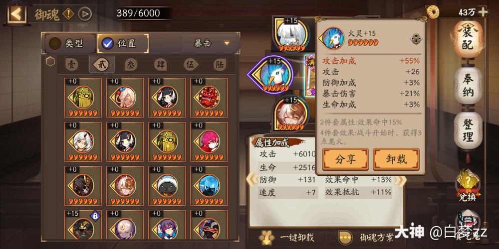 〖贰〗、御魂 御魂相当于式神的装备。每个式神有六个御魂槽(1~6号位),当该式神装备了2件同名御魂时,可获得该御魂的2件套效果,装备4件同名御魂时,除2件套效果外,还可获得该御魂的4件套特殊效果。御魂可为式神提供额外的属性(面板上红字显示)。