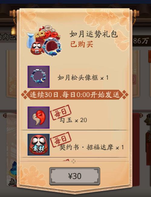 如月运势礼包无疑是值得购买的。购买后,不仅能享受到独特的如月松头像,而且每月的礼包都会赠送当月定制的头像框,仿佛体验到了炉石传说的卡背系统。更重要的是,每天还能获得丰富的奖励:勾玉20,招福达摩1个,以及每天经验和金币加成15%。