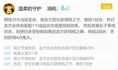 〖贰〗、在情报界面中,点击熏的大招图标,可以详细了解熏的大招效果。熏的大招可以驱散友方的负面状态,保护血量最低的友方,并增加鬼火数量。除了大招外,熏还拥有被动技能,能够提升友方的伤害输出。因此,熏在战斗中主要承担辅助角色,帮助队友更好地发挥实力。