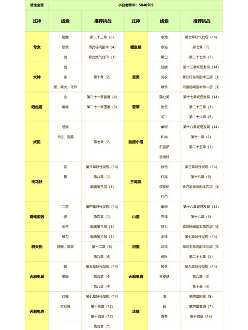 〖陆〗、对照表中还会推荐一些其他有关阴阳师的游戏资源,包括攻略、社群和论坛等,方便玩家进一步扩展自己的游戏世界。附阴阳师悬赏封印线索对照表是一款为阴阳师玩家提供便利的工具,通过对照表的使用,玩家们能够更加高效地完成悬赏任务,探寻封印之谜,解锁阴阳师世界的奥秘。