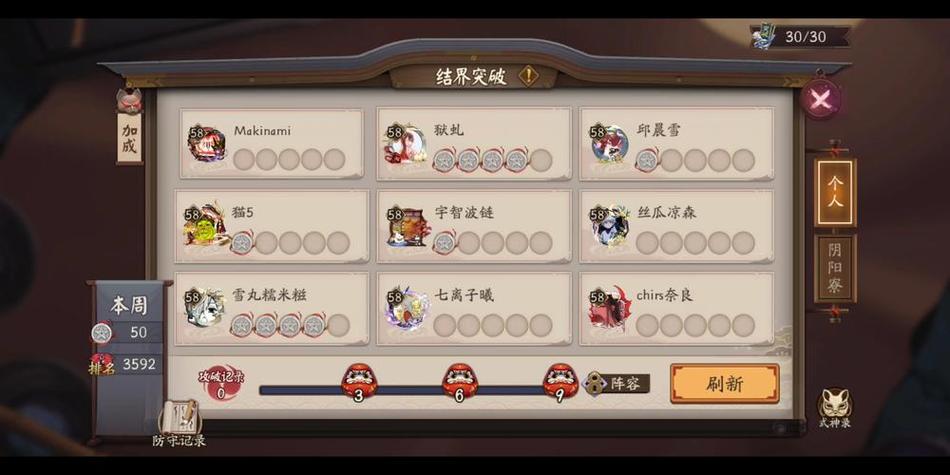 〖叁〗、阴阳寮结界突破攻破(每天会长/副会长开启,90%+才能打完)每个寮成员每次打通关退治会给加12个寮勋章 妖怪狩猎的麒麟攻破获得 小技巧:周末的攻破勋章数量加倍,把周五的突破留到0点之后攻破,得到双倍的攻破奖励。这样就有星期五,星期六,星期天三天的突破勋章奖励是双倍了呢。