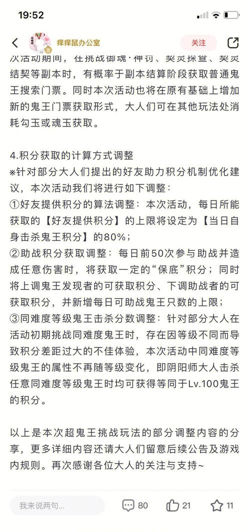〖叁〗、在阴阳师超鬼王活动中蹭分,可以通过以下几种方式:参与好友的超鬼王挑战:核心思路:在活动期间,你可以帮助好友挑战他们发现的超鬼王,从而蹭取一定的分数。操作建议:积极添加活跃且实力较强的大佬玩家为好友,这样他们发现的超鬼王往往星级较高,击杀后能获得的积分也更多。