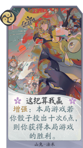 山兔是《阴阳师:百闻牌》里最为特殊的式神,是百闻牌的“欧皇”检测系统。使用某些卡牌会触发投骰子效果,只有骰子投出大于等于6时会有附加增益。有时甚至会让你直接获得游戏胜利(不过极难触发)。在使用三级形态牌后摇骰子的效果就变得可控啦。