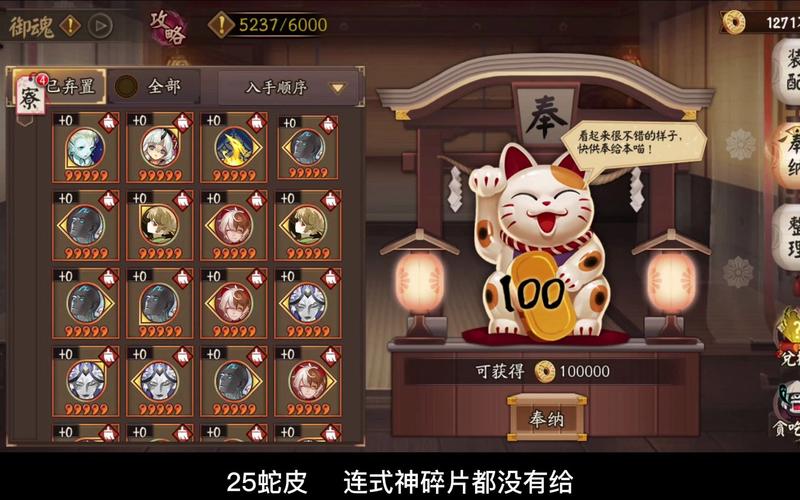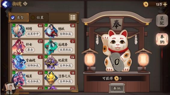 〖肆〗、功能介绍:这是回收途径,为了让堆积的无用御魂有所去处,多余的可以在御魂界面找招财猫批量奉纳得到金币。纳奉四星及以上御魂更有几率获得神赐的随机奖励(包括符咒、体力等,待测试)。