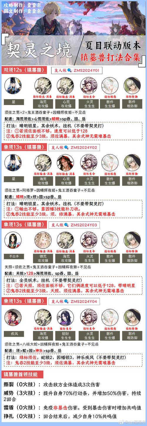 〖叁〗、- 御魂:莹草搭配树妖或散件,追求攻攻爆伤并满足满暴击;- 因幡搭配散件,追求爆伤指标;- 不见岳搭配散件,注重防御指标;- 绘卷无需特别搭配御魂。 综上所述,这就是《阴阳师》契灵小黑的速刷策略。了解这些后,快去游戏中尝试这个阵容吧!祝玩家们在游戏中玩得开心。
