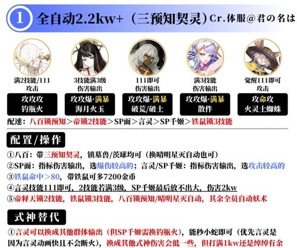 白藏主:提供保护和反击能力,有效应对控制队伍。 万年竹:反击式神,依靠反击触发协战效果。 御菜津:提供控制和反击能力,增加阵容的稳定性。 SSR蛇:提供额外的输出和变蛇翻盘的机会。御魂配置 不知火:剃魂,速生爆,70暴击,伤害指标。 食灵:火灵,速生/防,速度指标。