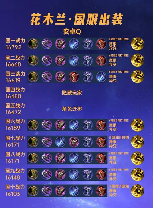 出装选取 核心出装:影忍之足、暗影战斧、不祥征兆、碎星锤、魔女斗篷。这些装备可以提供花木兰所需的攻击力、防御力和生存能力。可选装备:根据局势选取破军或血魔之怒。破军能进一步提升花木兰的收割能力,而血魔之怒则能在关键时刻提供额外的护盾和攻击力。