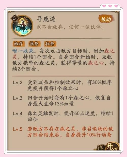 〖伍〗、通过消灭一个关键目标来触发“森之力”,可以迅速扭转战局。总结 综上所述,阴阳师小鹿男是一位非常有用的辅助式神。他的技能亮点在于能够为队友提供攻击和速度加成,这种加成效果在战斗中具有极大的战略价值。因此,对于追求战斗效率和翻盘机会的玩家来说,小鹿男无疑是一个值得培养和使用的式神。
