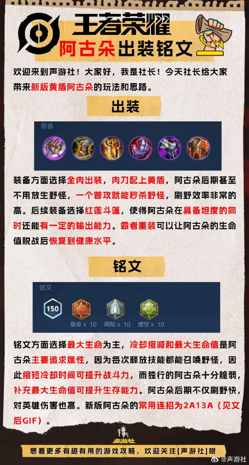 〖贰〗、王者荣耀阿古朵的出装和铭文搭配如下:出装: 打野刀:首先出一个小肉打野刀,后期合成大打野刀,增加对野怪的伤害和生命值。 冷却鞋:核心装备,提供15%的冷却缩减,使阿古朵更容易达到40%的冷缩上限。 红莲斗篷:由熔炼之心合成,提供物理防御和灼烧效果,增加阿古朵的生存能力和输出。