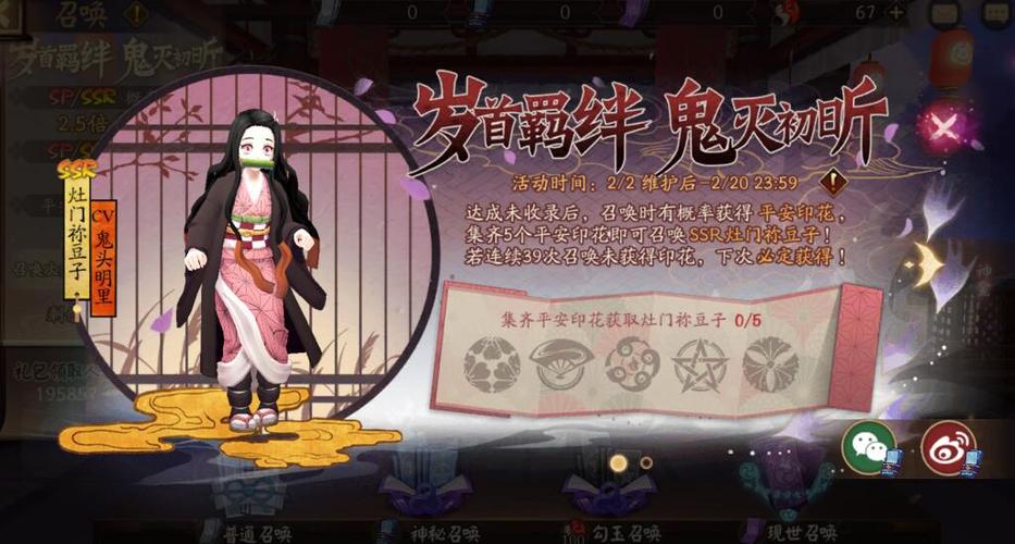 阴阳师中,要获得SSR灶门祢豆子,可以通过以下方式:联动活动召唤:在《阴阳师》与TV动画《鬼灭之刃》的联动活动期间,玩家可以通过召唤获得SSR灶门祢豆子。活动期间内,玩家可享受3次SP/SSR式神出现概率提升的机会,并且首次获得的SP/SSR必定为未收录。