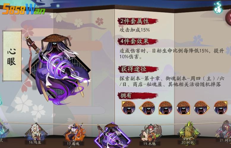〖叁〗、搭配推荐: 式神推荐:心眼御魂适合搭配那些擅长收割残血的式神,如茨木童子、鬼使黑、白狼等。这些式神在敌人生命值较低时能够发挥更大的伤害输出。 属性搭配:心眼御魂的2件套属性提供攻击加成15%,4件套属性则是对生命值低于30%的单位额外造成50%的伤害。