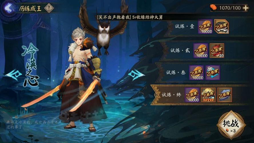 〖壹〗、阴阳师冷漠之心历练4的打法攻略如下:关卡特性与通关目标 关卡特性:在冷漠之心历练4中,玩家需要在每次消耗3体力的3分钟内击杀场上所有敌人以通关。此外,该关卡存在一个特殊效果,即单次伤害不会超过3万。通关目标:成功击杀所有敌人,并在通关后解除“成王”活动中Boss山风的强力技能。