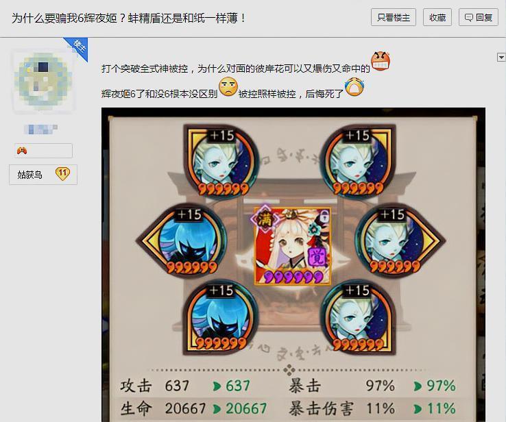 〖陆〗、阴阳师效果命中计算公式为:技能实际命中概率=基础命中概率*(1+效果命中数值)/(1+效果抵抗数值)那么30%命中效果只是让雪女的大招的冰冻概率从8%挺高了到了5%,哈哈,很多人要开始说了,就这么点啊,那我不堆了,效果命中根本没用。此贴完结。