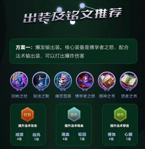 登峰造极的输出装 出装次序:回响之杖+秘法之靴+痛苦面具+博学者之怒+虚无法杖+贤者之书。 出装思路:此出装以最大化输出为目标,装备选取均以提高法术强度和法术穿透为主。回响之杖和博学者之怒能全面提高输出,不给敌人反手的机会。