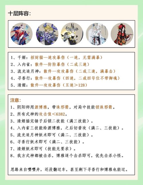 〖贰〗、第17层速刷阵容:可根据自身拥有的式神进行搭配,以高效通关为目标。第9层阵容:推荐使用具有单体输出能力的式神,如鬼切、茨木童子等,以及控制类式神如阎魔、般若等,以应对不同的战斗情况。第10层阵容:需要特别注意控制双方式神数量,可搭配牺牲型式神和强力输出式神。