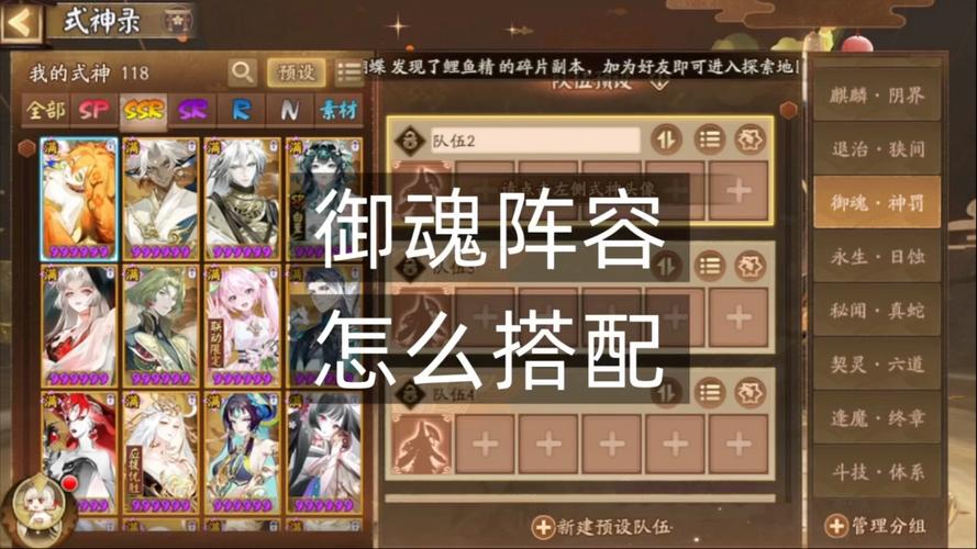 阴阳师魂王神罚阵容推荐如下:阵容一 成员:祸津神+天照+瑶音紧那罗(SP紧)+龙吟铃鹿御前(SP铃鹿)+缈念萤草(SP草)配速:祸津神天照152SP紧142SP铃鹿、SP草注意事项:天照攻击需高于SP紧和SP铃鹿(SP铃鹿攻击接近SP紧),源赖光可换晴明,此时SP紧低速即可。