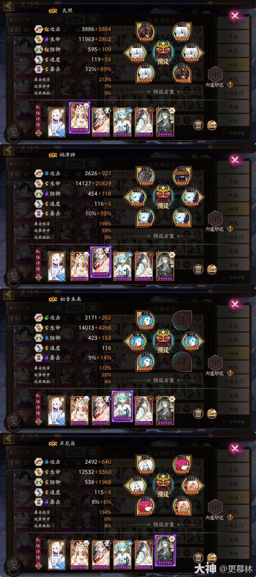 御魂选取 针女四件套:针女御魂是姑获鸟的核心御魂,能够大幅提升其输出能力。 暴击两件套:选取暴击两件套以提升暴击率,尽量将暴击堆凑到一个较高的水平。 六号位暴击御魂:六号位选取暴击御魂,以最大化输出。