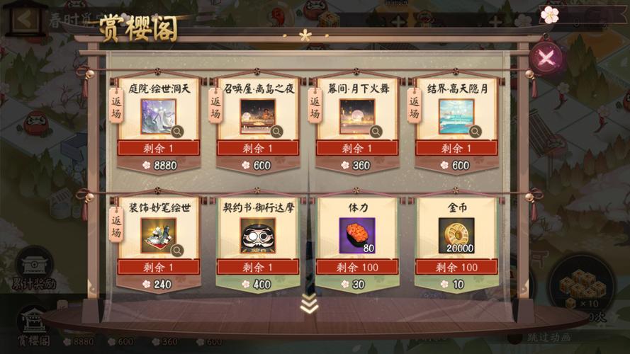 〖伍〗、金币:游戏内的通用货币,可用于购买各种道具和招募式神。体力药水:恢复角色体力,让玩家能够继续进行游戏任务。妖气:可用于兑换式神碎片和道具等。皮肤:普通皮肤:可通过游戏内任务或活动免费获得,增加角色的外观美感。限定皮肤:通常通过特定活动或抽奖获得,具有更高的稀有度和收藏价值。