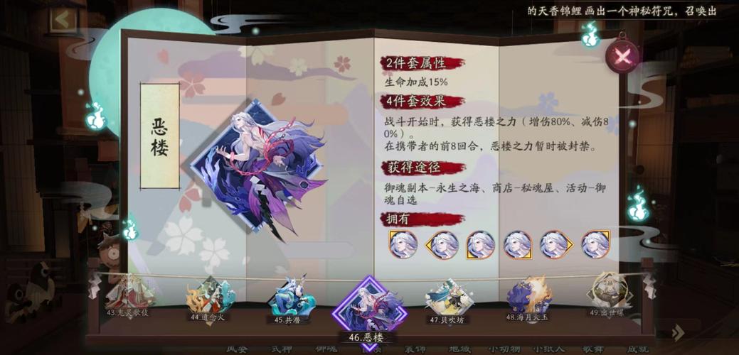 在阴阳师游戏中,恶楼御魂的搭配需要考虑式神的属性与技能。常见的适合恶楼御魂的式神包括千姬、SP面灵气、面灵气、SP雪女、SP青行灯等。战斗开始时,携带恶楼御魂的式神会获得“恶楼之力”,这会使伤害提升80%,同时防御降低80%。这种效果在携带者的前8个回合内会被暂时封禁。