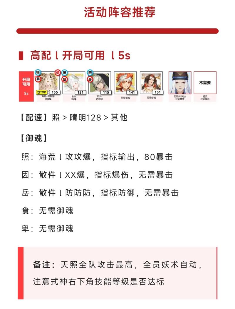 低配挂机:清千+双针姬AOE+丑女或绘卷(半血以上);清追+针姬AOE+云外镜+丑女或绘卷(半血以下)。阵容二:角色组合:帝释天、绘卷、晴明、SP追月、月读、铃彦姬。御魂配置:绘卷隐念歌姬攻攻攻;SP追月钓瓶火防防防;月读、铃彦姬针女歌姬攻攻暴伤。