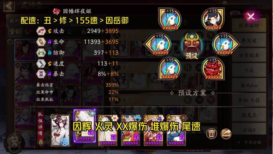 〖肆〗、一般来说,选取能够提供额外鬼火或增益效果的御魂会更加合适,如招财、火灵等。同时,也可以考虑一些能够提供生存能力的御魂,如蚌精、薙魂等,以确保SP流光追月神在副本中的持续作战能力。综上所述,SP流光追月神是一位非常灵活的式神,可以根据不同的场合和队伍需求进行不同的养成和御魂搭配。