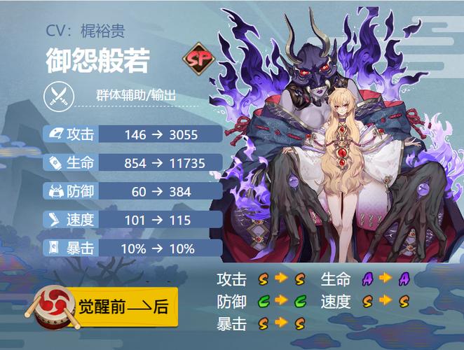 〖陆〗、御怨般若御魂搭配建议如下:日女巳时:理由:日女巳时御魂能够提供推条效果,即减少敌方行动条的比例,这对于御怨般若来说非常有用,因为他可以在结界持续期间进行多次攻击,从而更有效地控制敌方。搭配属性:主要堆生命和速度,速度越快越好,以便更快地释放结界和推条。