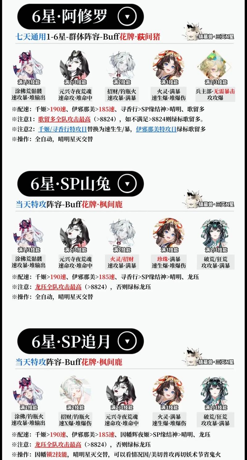 第一套:最平民的配置,48s无SP茨木无暴伤无成型狂骨还可以带两个狗粮。【双食发鬼、玉藻前、茨木童子、丑时之女】一速食发鬼是满暴土蜘蛛破势。二速晴明星灭。三速玉藻前普通的满暴破事,暴伤堆200左右。四速茨木普通满暴破事荒骷髅,也是暴伤堆200左右。