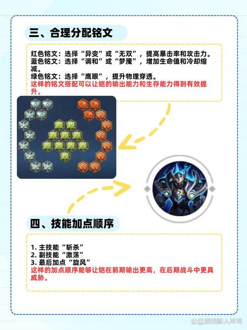 〖壹〗、出装推荐抵抗之靴、暗影战斧、宗师之力、无尽战刃等核心装备。抵抗之靴可以减少被控制的时间,暗影战斧提供物理穿透、冷却缩减和血量加成,宗师之力强化普攻,无尽战刃则是暴击伤害的核心装备。铭文方面,可以选取十个无双作为核心,配合鹰眼和狩猎,提升物理穿透和吸血效果,进一步增强一刀秒人的能力。