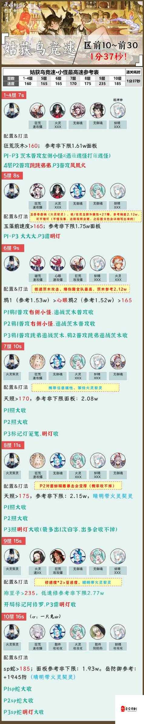 核心式神:不知火+待宵姑获鸟辅助式神:久次良+镰鼬+八岐大蛇御魂搭配:不知火:火灵,攻生暴伤,速度128以上,确保开场能稳定供火。久次良:招财猫速攻暴击,全队二速,提供拉条和输出。镰鼬:招财猫,全队一速,负责先手拉条。待宵姑获鸟:针女,攻攻暴伤,满暴击,速度128以上,最大化输出能力。