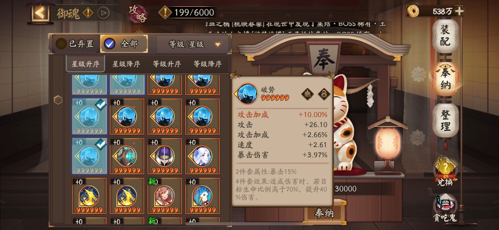 号位4号位的五星全部奉纳。6号位的五星(攻击加成、防御加成和生命加成)全部奉纳。自从官方把体验服的特殊御魂加点的功能给去掉后,我们囤的特殊属性的五星御魂就失去了价值。因此游戏娘2和4的五星是全部卖掉的。但是六号位比较特殊,有些好的五星暴击和爆伤是可以用的,比如下面这个。