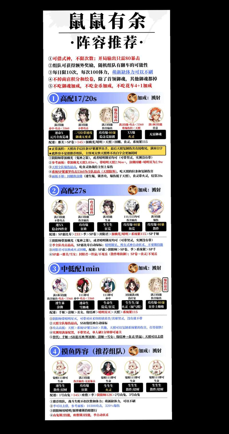 〖贰〗、推荐阵容:招财镰鼬、招财蜜桃、雪幽魂鬼使白、火灵小松丸、招财追月,阴阳师选取带星陨的比丘尼。速度调整:小松丸速度调整到和追月一样,翻牌时先上小松丸再上追月,确保追月先开大防止断火。