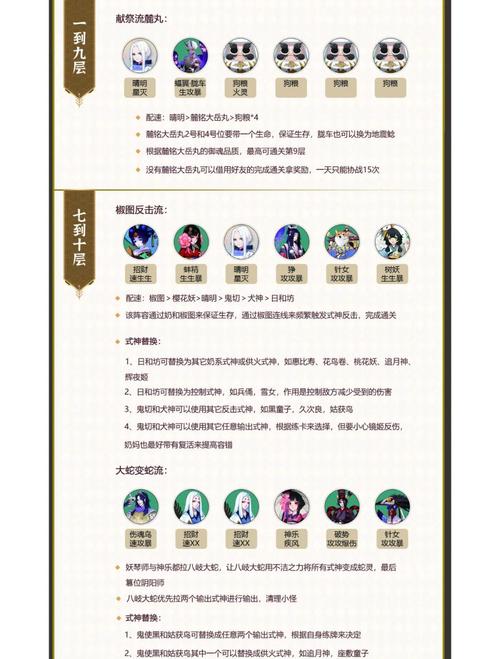 -8层:建议使用双拉+两个AOE式神进行快速通关。如果伤害不足,可以考虑使用椒图+奶妈+2个输出+打火机的组合。第9层:推荐使用四保一阵容,如辉夜姬+椒图+桃花妖+匣中少女+荒。第三回合对面独眼小僧较为棘手,击杀顺序为:樱花妖→万年竹→犬神→奉为达摩→独眼小僧→彼岸花。
