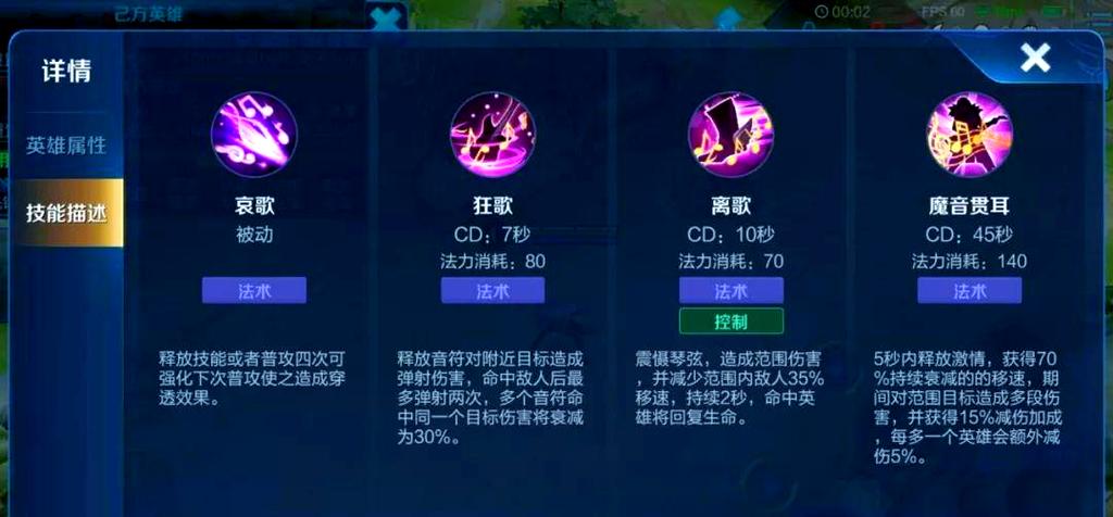 一技能:狂歌:关键伤害技能,对附近敌人造成法术伤害并弹射,至多弹射2次。建议主升。二技能:离歌:核心控制技能,对附近敌人造成伤害并减速。随着等级提升,伤害和减速幅度增加。建议副升。三技能:魔音贯耳:爆发伤害的核心技能,拥有高额免伤效果,使高渐离能在团战中贴身输出。有大招时优先升级。