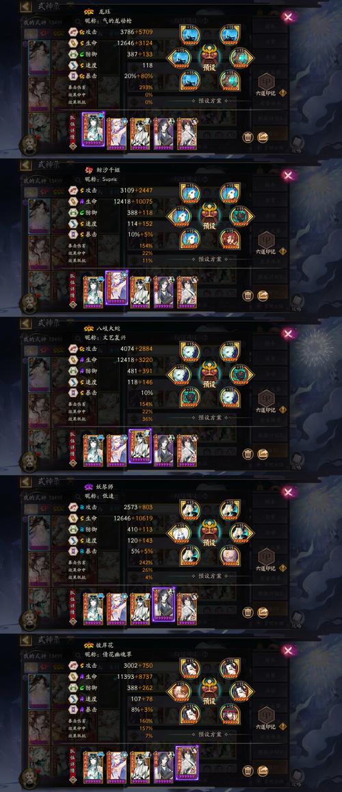 输出:6星妖刀(或其他多段针女式神,如鸟、狗、佛等)。建议速度+攻击+暴击,4针女+2生命套,2号位速度,以避免插队导致缺火。供火:5星座敷童子。速度+生命+防御,保证稳定供火。主奶:5星桃花妖(或花鸟卷、萤草)。速度+生命+生命/暴击,高速满暴,不强求套装。