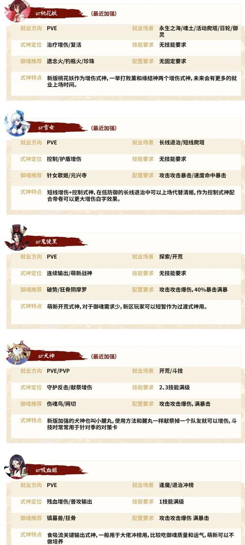 〖叁〗、SSR式神御魂搭配: 大天狗:针女四件套+暴击两件套,提升多段伤害输出。 茨木童子:破势四件套+暴击两件套,增强初始攻击伤害。 小鹿男:被服四件套+暴击两件套,增加生存能力和暴击。 荒川之王:网切四件套+暴击两件套,无视部分防御造成伤害。 酒吞童子:轮入道四件套+伤害或暴击,增加连续行动机会。