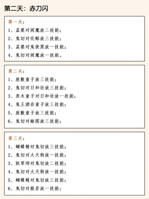 〖壹〗、第一关的过关步骤如下:首先使用般若对慧明灯进行普攻,然后三尾狐使用三技能攻击座敷,最后管狐使用三技能击杀妖刀姬,这样就可以顺利通关第一关。第二关的通关步骤为:首先茨木一号对妖刀姬进行普攻,接着慧明灯使用三技能召唤灯笼,最后茨木二号使用三技能标记妖刀姬,以此完成第二关的通关。