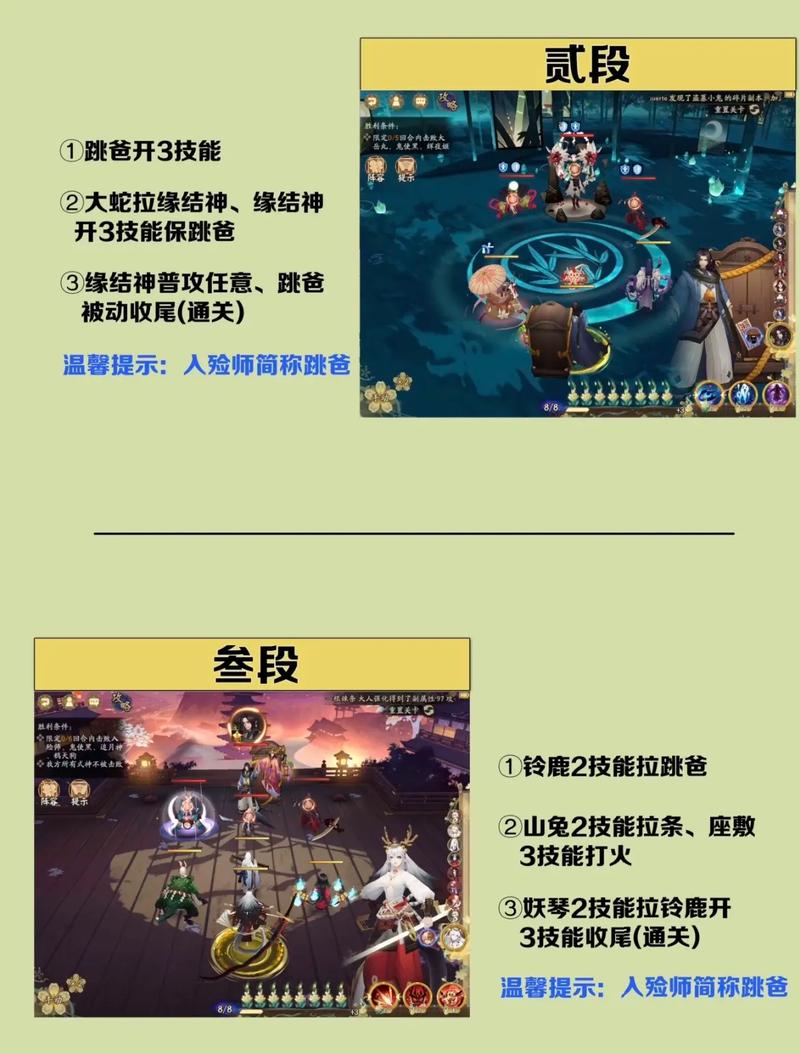 阴阳师残局得胜听君言怎么过一段:星熊童子3技能放给敌方跳跳弟弟,茨木普工跳弟,涂佛薰普攻增伤,其余单位妖术挂机自动即可二段:星熊童子3技能放给敌方日和坊,敌方雨女驱散后,星熊普攻控制敌方般若,座敷童子3技能打火,狂骨玉藻前3技能堕天触发狐火,后续妖术挂自动妖刀收割即可。
