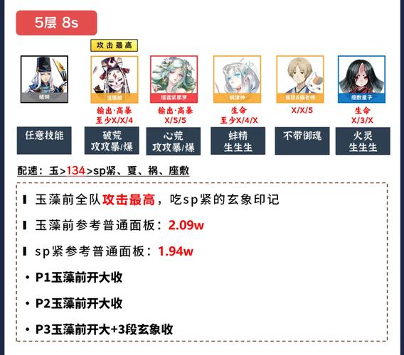 推荐阵容:一速镰鼬(速度散件),二速青行灯(2速度4攻击6暴伤,破势/轮入道),三速山兔(2速度4生命6生命,招财套),四速座敷(火灵套装),尾速荒(2攻击4攻击6暴击/暴伤)。此阵容利用镰鼬和山兔的拉条效果,使灯姐和荒能多次行动,有效输出和控制。
