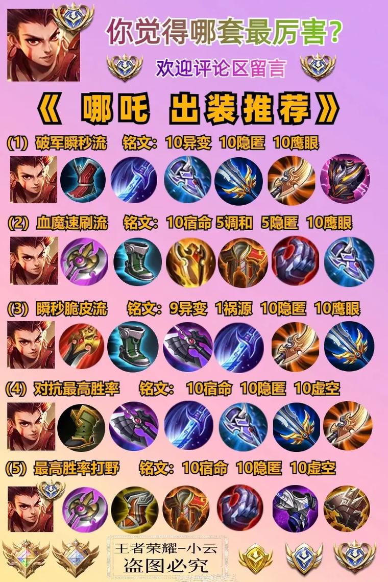 〖叁〗、出装推荐 核心装备:破军:提升哪吒的伤害输出,尤其是真实伤害部分,同时增加生命偷取,提高续航能力。名刀·司命:增强哪吒的生存能力,特别是在技能免疫控制效果期间,提高战场存活率。辅助装备:抵抗之靴:增加哪吒的移动速度,便于追击和逃脱。冰痕之握:提供额外的控制效果,使哪吒在团战中更具威胁。