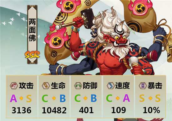 - **怒目**:两面佛的被动技能,根据脸色变化有两种效果。当两面佛呈现红脸时,能降低攻击对象的防御属性;蓝脸时则降低敌方的攻击强度。- **电闪雷鸣**:消耗3点鬼火,对敌人造成多次伤害,并且每一次造成伤害后都会切换脸色。这个技能一边造成伤害,一边降低敌人的攻击强度和防御属性,且影响全体敌人。