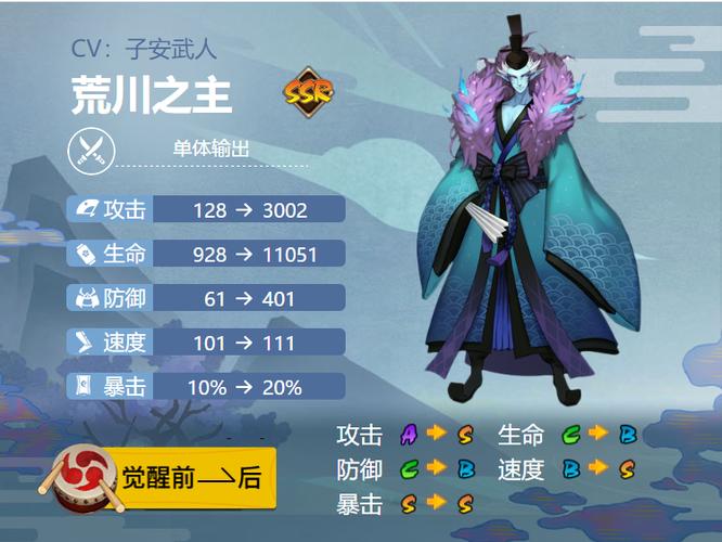 〖伍〗、阴阳师手游新版荒川之主属性及技能分析详解 在阴阳师这款游戏之中,虽身为SSR,然而在多数人的寮院内荒川并没有得到像其他输出式神一样的优待。由于荒川使用率过低,导致大狗子想通过斗鸡解锁个传记都难。