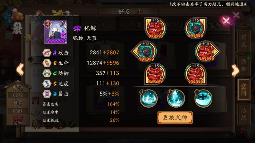 地藏像4件套+防御2件套 御魂搭配理由:地藏像御魂能够为化鲸提供额外的护盾效果,增强其生存能力。搭配防御2件套可以进一步提升化鲸的防御属性,使其在面对物理攻击时更加坚韧。御魂位置选取:2号位:速度,确保化鲸能够快速行动,及时为队友提供支援或控制。
