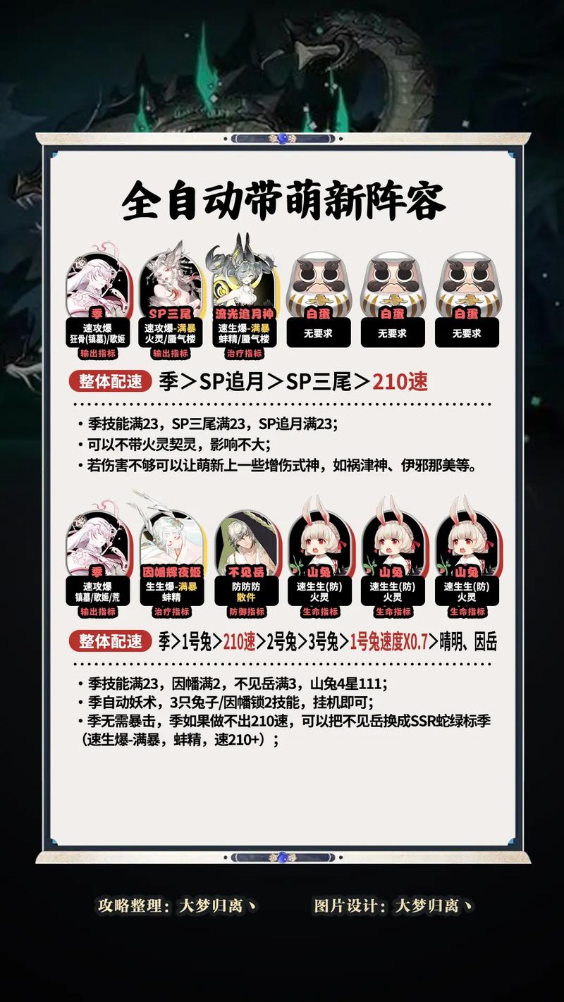 〖肆〗、阴阳师SSR八岐大蛇阵容推荐选取白藏主、日和坊、双鹿加上八岐大蛇。以下是具体的分析和建议:御魂配置:八岐大蛇推荐使用地藏像御魂,246号位选取速抗生。这种配置可以提供必要的战斗空间,尤其是在斗技中。阵容核心:白藏主:提供生存保障,增强队伍的坦度。日和坊:同样提供生存支持,通过治疗保证队伍续航。