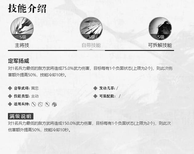 技能—追击潜能:增加攻击力、加速,并能瞬间取消炮架形态。是黄忠的重要逃生和追击技能。2技能-警戒地雷:放置地雷,可探测敌方行踪、减速和破甲。用于撤退和追击都非常有效。3技能-重装炮台:黄忠的核心技能,架起炮台进行远程攻击。使用时需注意安全,危险时立刻用1技能收起炮台。