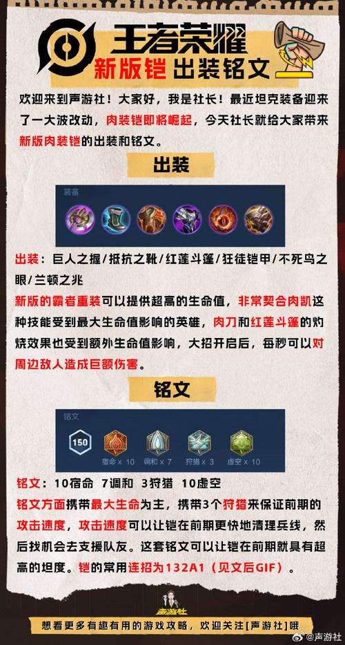 S40赛季玩国一铠的套装,可以借鉴以下出装和铭文思路:出装方面:前期装备选取:前期可以选取适合铠的打野或边路装备,如红莲斗篷(但需注意其改版后属性已不适合打野)、陨星等。随后合成苍穹,此时已经不缺CD,可以将鞋子换掉,再升级大肉装。