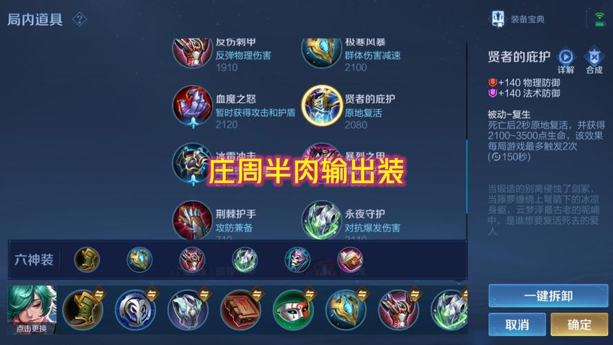 影忍之足:增加物理防御,适合庄周免控特性。极寒风暴:减少技能冷却时间,提供物理防御和寒冰冲击效果。近卫荣耀:增加自身血量,提升友方输出,适合团队作战。魔女斗篷:提供法术防御和血量,增强对法师的抗性。痛苦面具:唯一输出装,造成目标当前生命值8%的法术伤害,减CD。
